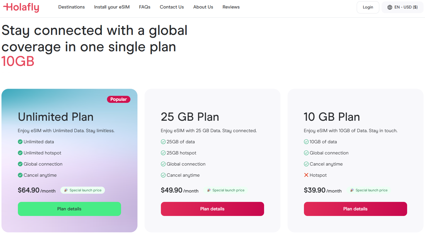 Holafly獨有的月租方案有三種,分成每月10G、25G和吃到飽,月租期間可以在全球任何國家或地區使用(甚至跨洲使用都沒關係!),不需要再更換、購買新的esim卡,非常方便,適合需要長時間、多國旅遊的人使用~