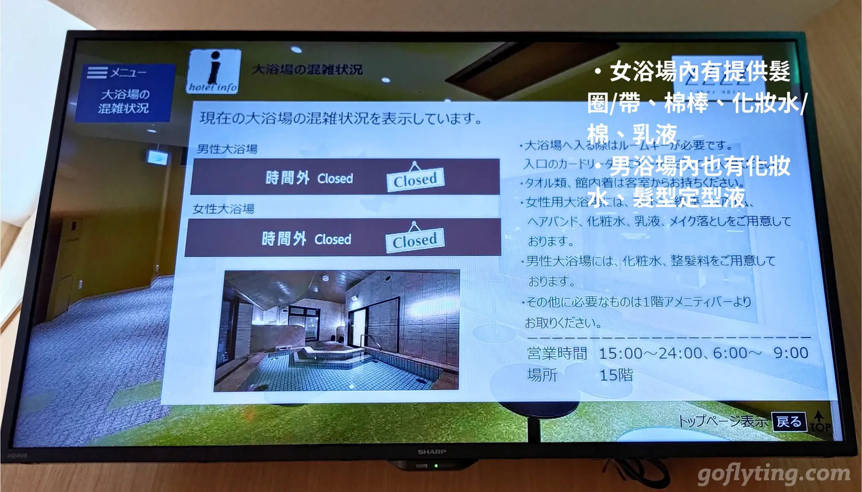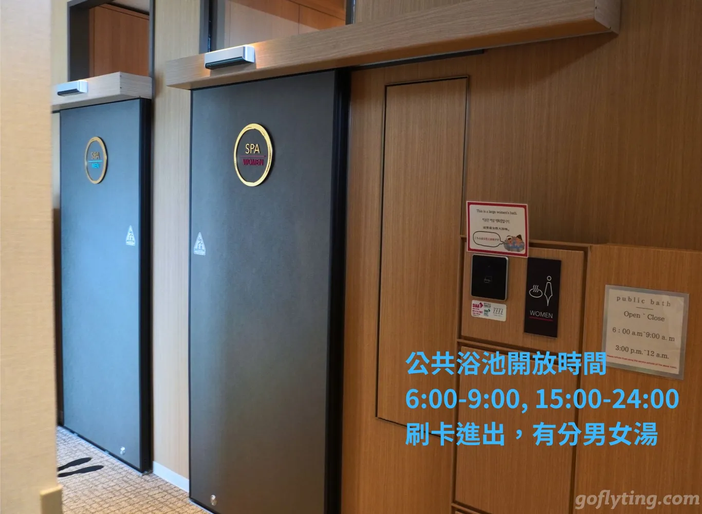 飯店房間內雖然沒有浴缸,但在15F頂樓有大浴池,每天早上6點到9點、下午3點到凌晨0點都會開放。浴場入口旁就有可上鎖的置物櫃和自動販賣機。