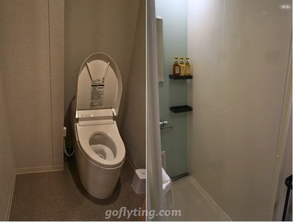 房間的廁所和衛浴是分開的,廁所在一進門玄關旁,浴室則在另一頭。浴室算是一個人在裡面不會侷促的大小,有附洗潤髮、沐浴用品,也有還不錯用的吹風機。有一點不方便的是廁所沒有洗手台,上完廁所得要再繞到浴室前洗手。