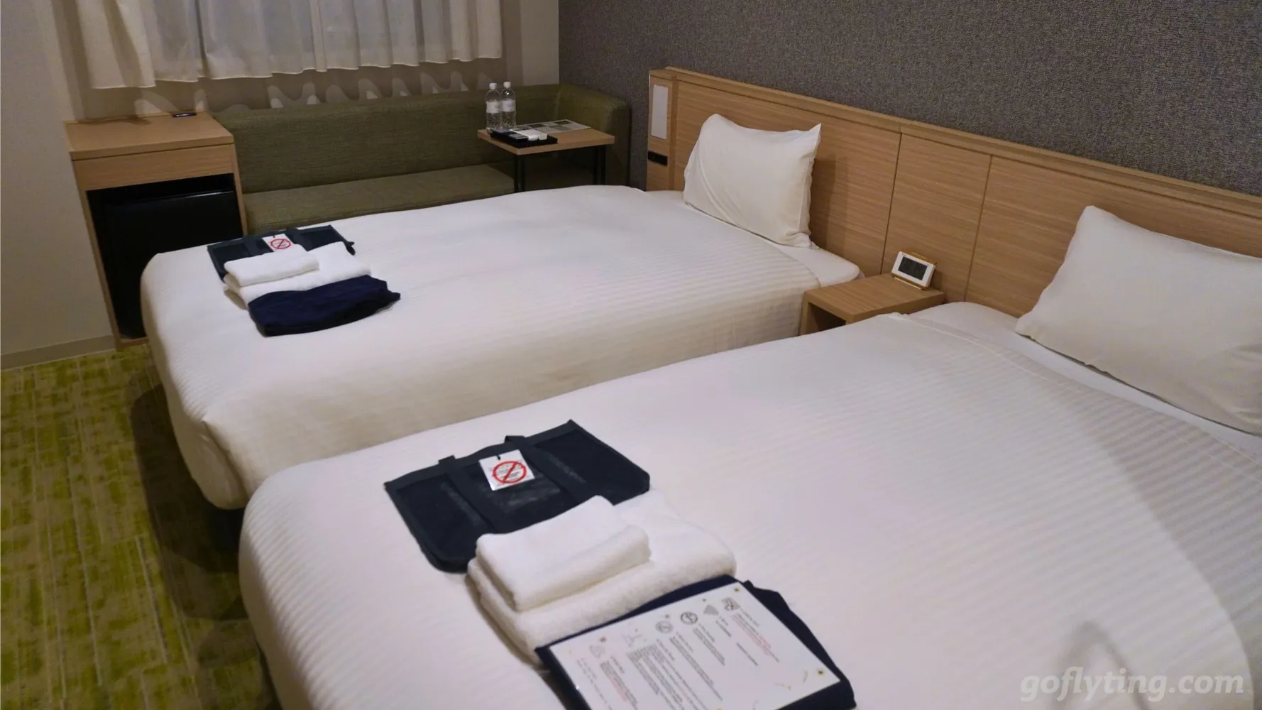 我們訂的是6坪大的雙床房,不過還是顯得有點小,沒辦法同時攤開兩個行李箱。房間有附睡衣、兩瓶水,床是軟硬適中的、枕頭有彈性,角落還有一台小小的加濕器(照片中沒拍到)。